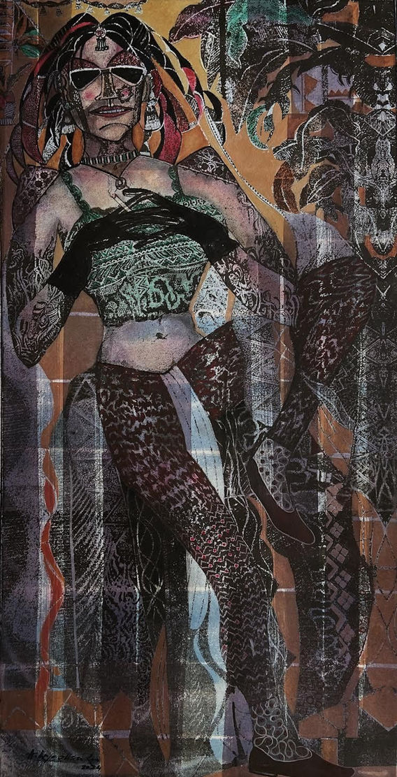 “Smoking Jone” is a provocative and playful take on contemporary self-fashioning. With a richly patterned surface and layered textures, Rajeswara Rao captures a character who is both stylized and subversive, adorned in sunglasses, bold clothing, and intricate body art. The confident posture and unapologetic gaze invite the viewer into a moment that blurs the line between performance and authenticity. Surrounded by motifs of nature and design, the figure becomes a statement on modern identity, shaped by aspiration, rebellion, and cultural remixing. Rao’s work invites us to ask not just who this person is, but what they represent in a society where self-image is both power and performance.